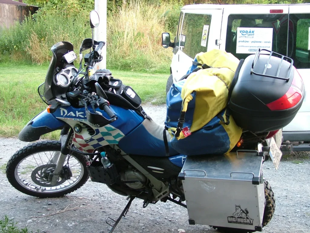 Kufry. Když pominu cenovou náročnost už TENKRÁT, rámečky ke kufrům 3500 Kč, jeden kufr 4000 Kč, problém byla váha, jeden kufr 5 kg a nosiče další 4 kg. To znamená 14 kg, a to jsou prázdné, navíc jsem je ještě musel vylepit, aby nebarvily. Teklo do nich, takže řešit další vaky. No nic, jiná varianta nebyla, tak jsem začal jezdit. Jenže jsem zjistil, že můj BMW 650 GS Dakar docela cítí odpor vzduchu od kufrů. Ale nedalo se nic dělat, smířil jsem se s tím a začal s odporem počítat. Dalším problémem bylo, že jsem ztratil výhodu úzké motorky na silnici. Takže když jsem jel s plným vybavením, tak jsem se v kolonách koupal ve vlastním potu a pekl se jako jiná auta. I když mě to hrozně štvalo, snažil jsem se to brát jako daň. Jenže se objevil jiný problém.